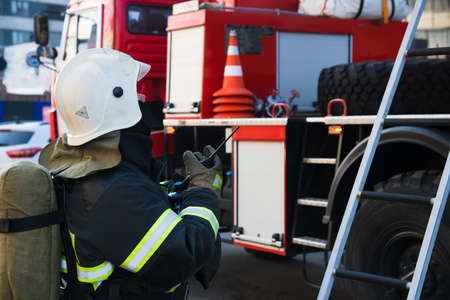 Firefighter stands at a meeting of a fire truck