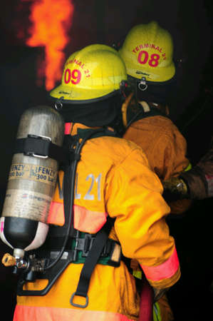 fireman standing in row with fire fighting protection suit and equipment standby for operation
