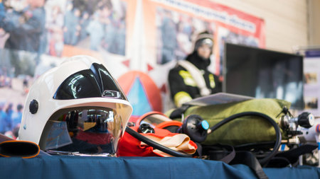 Special equipment of rescue worker - mask, helmet, oxygen cylinder at emergency services show