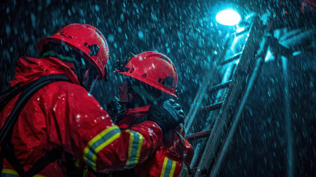 Firefighters climbing a ladder in stormy weather, battling strong winds and rain.