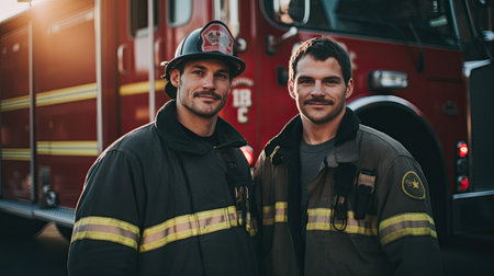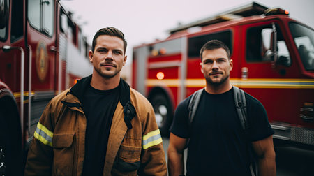 firefighter and fireman in uniform standing in front of fire engine