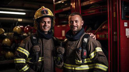 Two firefighters dressed in workwear with helmets in fire station.
