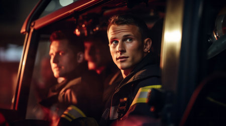Group of firefighters in truck. Brave teamwork for fire safety and community protection
