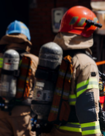Team of Professional Firefighters Ready in Full Gear for Dangerous Situations