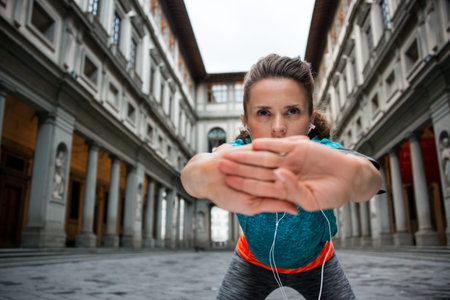 Fitness woman stretching near uffizi gallery in florence, italy