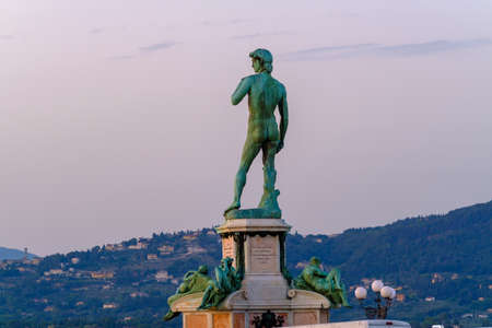 Florence, italy - August 12, 2019: Aged Statue of David mounted on pedestal on Piazzale Michelangelo against hill and sundown sky in evening