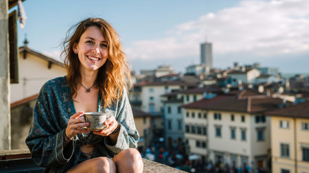 A woman with long hair is sitting on a ledge holding a cup of coffee and smiling at the camera