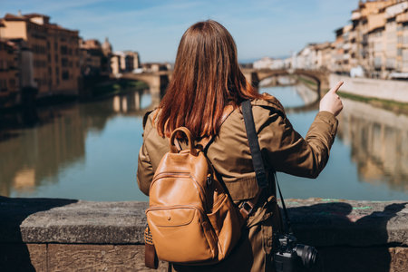 Young stylish woman walking near Holy Trinity bridge in Florence city, visiting famous italian landmarks. Idea of italian style and travel