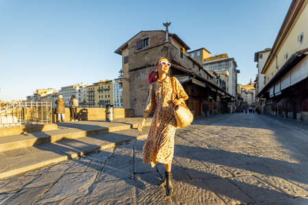 Woman walking on famous old bridge, called Ponte Vecchio, in Florence. Concept of traveling italian landmarks. Stylish woman with colorful shawl and sunglasses. Wide view on sunrise