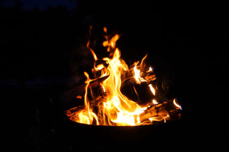 Bonfire burning at night, camp fire ant fire pit, flames and fire sparkles, nighttime photography