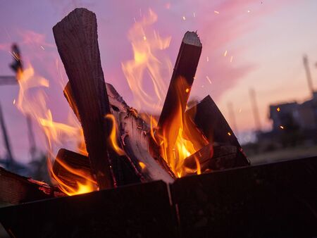 Burning firewood in a large grill, a homemade picnic in the fresh air.