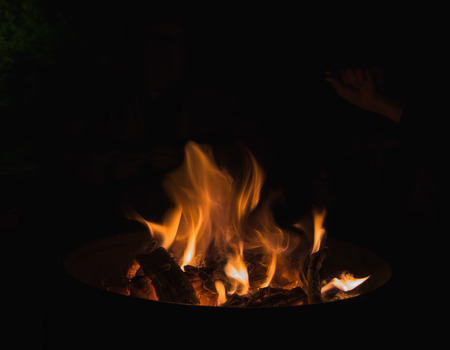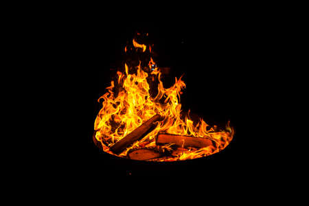 Flames in a firepit at night. Close up of flames surrounded by darkness
