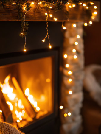 Soft twinkling lights enhance the warm ambiance around a glowing fireplace, creating a cozy atmosphere perfect for winter evenings.