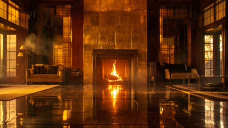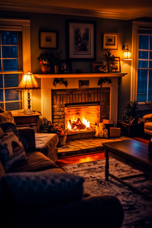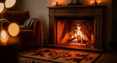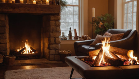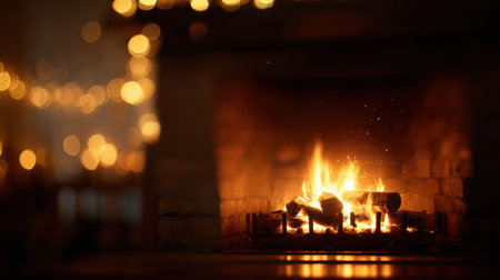 Flickering flames dance in a fireplace, illuminating a cozy room adorned with soft lights, perfect for a relaxing night indoors as winter sets in.