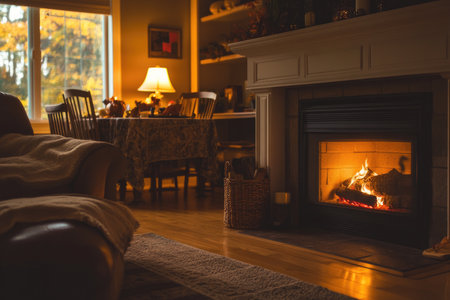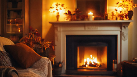 A beautifully warm and inviting living space, complete with a cozy fireplace and delightful autumn ambiance