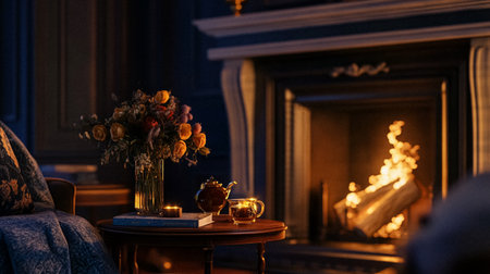 Cozy living room with fireplace, books and cup of hot drink