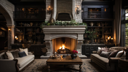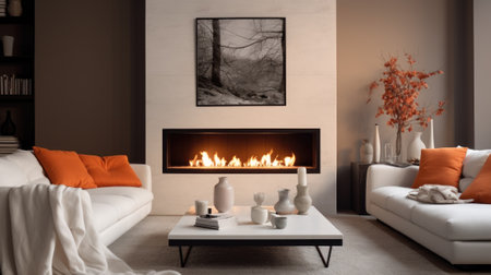 Inviting living space with fireplace and cozy atmosphere for ultimate comfort. Illustration for cover, interior design. AI generative.