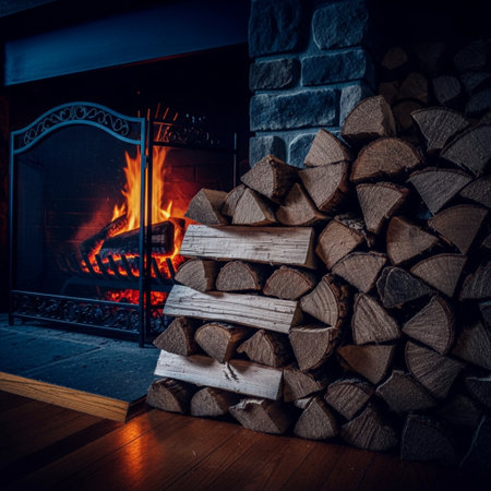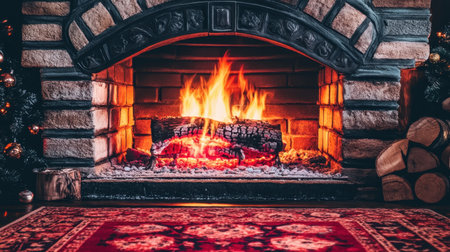 A stunning fireplace scene featuring bright flames, a traditional stone design, and firewood, creating a cozy and inviting atmosphere perfect for winter evenings.