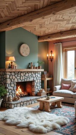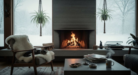 Cozy Scandinavian-inspired living area features a warm fireplace, natural decor elements, and comfortable seating. Soft textiles and greenery create a welcoming ambiance for relaxation.