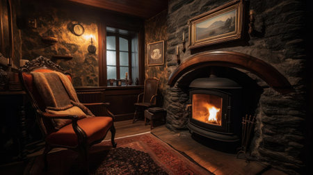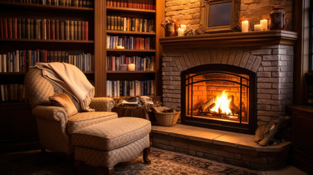 A cozy fireplace with a crackling fire and a comfortable armchair created with Generative AI