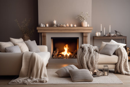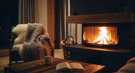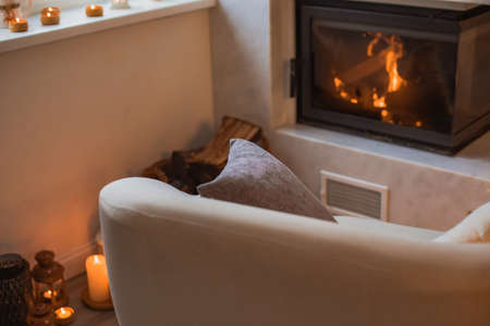 Cozy living room with fireplace and warm plaid. Cozy winter evening at home.