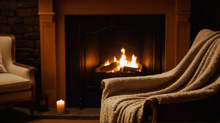 Cozy living room with fireplace, armchair and knitted blanket