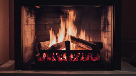 A cozy fireplace with burning logs in a home interior, emitting warmth. The fire is set against a brick background, creating a comforting and relaxing atmosphere. AI generative