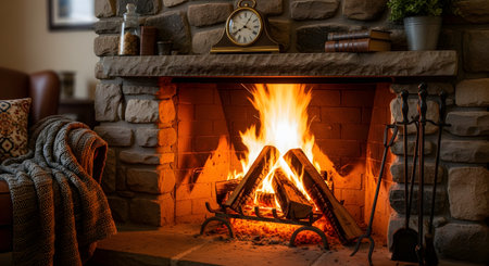 A warm and inviting stone fireplace with a roaring fire provides a cozy focal point in a rustic living room. A comfortable chair with a blanket is nearby, and the mantle is decorated with a clock and books, creating a perfect hygge atmosphere for a cold evening.
