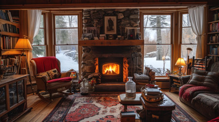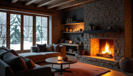 A cozy mountain cabin interior featuring a warm fireplace, wooden decor, and a stunning snowy view, creating the perfect winter relaxation retreat and inviting ambiance.