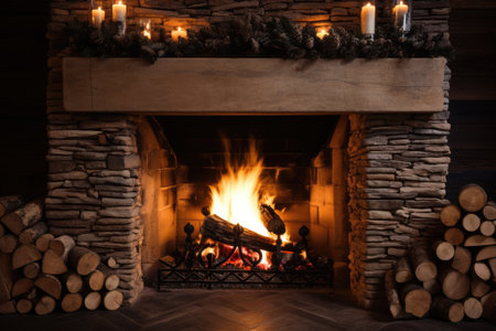 AI Generated. Cozy Stone Fireplace with Warm Fire and Holiday Decorations