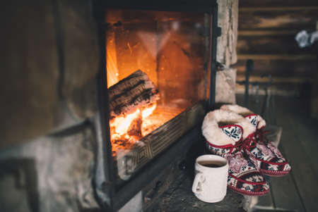 Warming up by the fire, cozy winter night in the cabin by the fireplace, fire burns in the scandinavian cottage, burning fire with the charcoal and firewood