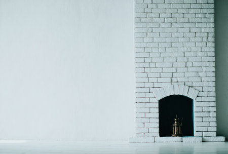 Minimalist white wall with a white brick fireplace featuring a dark alcove