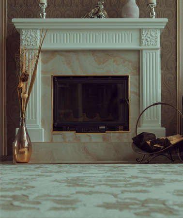 Interior of cozy living room with fireplace, vintage photo camera, coffee table and books