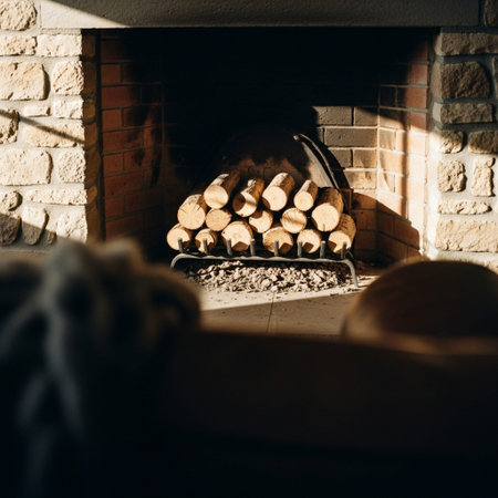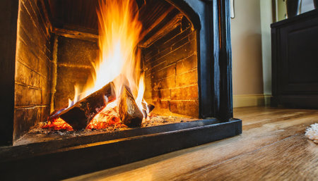 Bright flames dance in a cozy fireplace, creating warmth and comfort in a charming living room setting during a winter evening