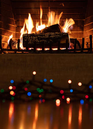 Christmas fireplace burning. Warm cozy Xmas holiday home, blur glowing colorful lights decoration background, reflections on the floor