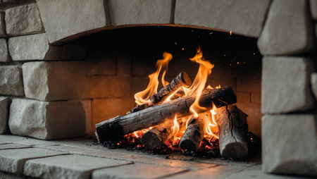 A cozy fireplace with burning logs and glowing embers in a rustic brick setting. Concept of warmth, comfort, and relaxation. AI generative