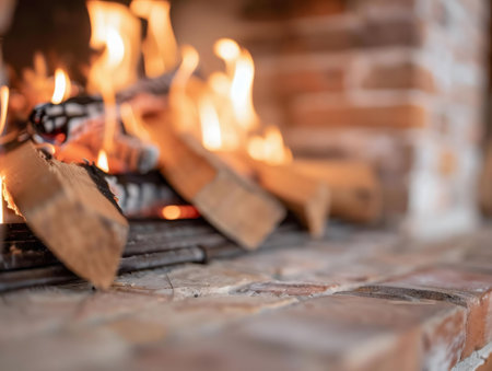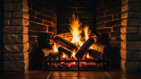 A cozy fireplace with burning logs in a home interior, emitting warmth. The fire is set against a brick background, creating a comforting and relaxing atmosphere. AI generative