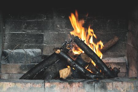 Warm cozy burning fire in a brick fireplace close up. Cozy background