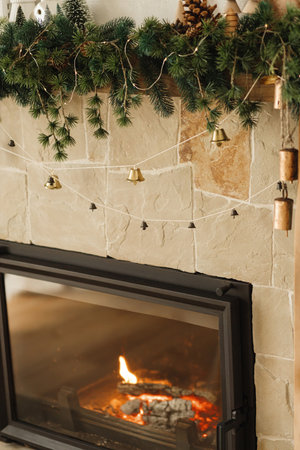 Stylish fireplace mantel decorated with christmas branches, bells garland, wooden ornaments. Festive rustic christmas fireplace decor in modern farmhouse living room