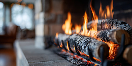 A close-up view presents a fireplace with burning wood logs emitting warm orange and yellow flames. The scene displays a rustic setting, with a blurry background suggesting an indoor environment. The image evokes feelings of comfort, and relaxation, suitable for commercial projects.