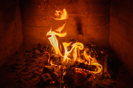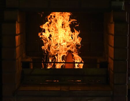 brightly burning flame of fire in the fireplace of brick