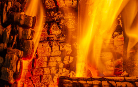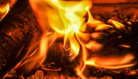 Burning fire with red, orange and yellow flames background. Arson, fire safety and danger theme. Camp fire in the night. Burning firewood in the fireplace.