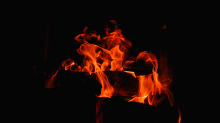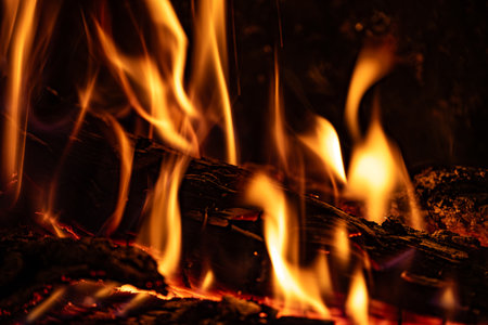 Burning firewood in the fireplace closeup, texture of fire and flame, dark background
