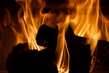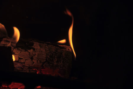 Firewood burning in fireplace fire red ashes heat