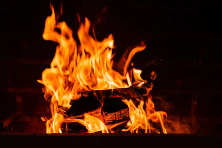 Fire flames on abstract art black background texture. Home Fire burning in brick fireplace. A fire burns in a fireplace