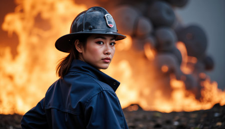 A determined female firefighter in a dark blue uniform and helmet stands calmly in front of a blazing fire.
