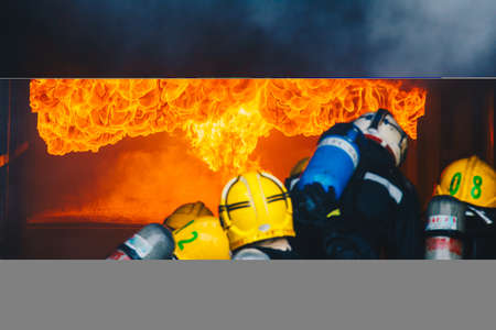 Firefighters using water fog fire extinguisher to fighting with the fire flame in large building. Firefighter and industrial safety disaster and public service concept.