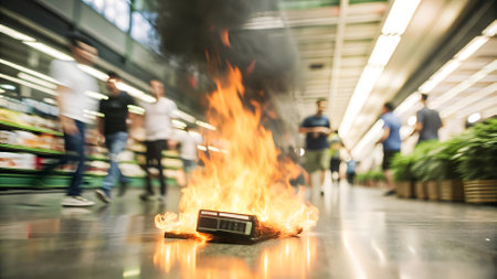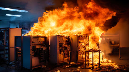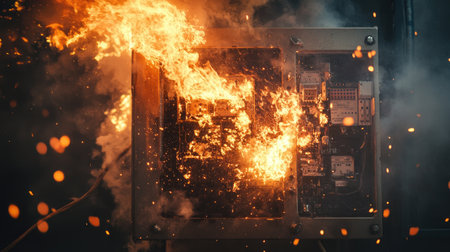 Photo of lithiumion battery fire illustrating safety hazards and risks emphasizing the importance of fire prevention. Concept Fire Safety, Lithium-ion Batteries, Fire Hazards, Risk Prevention