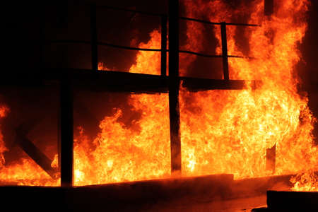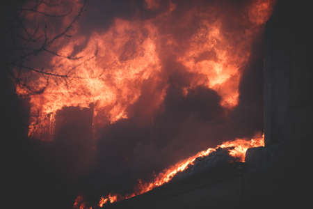 Massive large blaze fire in the city, brick factory building on fire, hell major fire explosion flame blast, with firefighters team firemen on duty, arson, burning house destruction