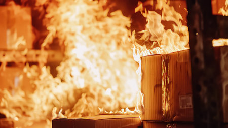 A close-up of the flames in an office room with fireproof walls and rows of wooden boxes on shelves, all set ablaze. The focus is on one box that's being warped by the heat as it rises from under its bottom edge, indicating warmth emanating through the material. This scene conveys intense emotion, emphasizing impact, depth, and realism. --ar 3:2 --v 6.1 Job ID: c6efb297-5c8b-47da-b4d5-4a2c85666ea7